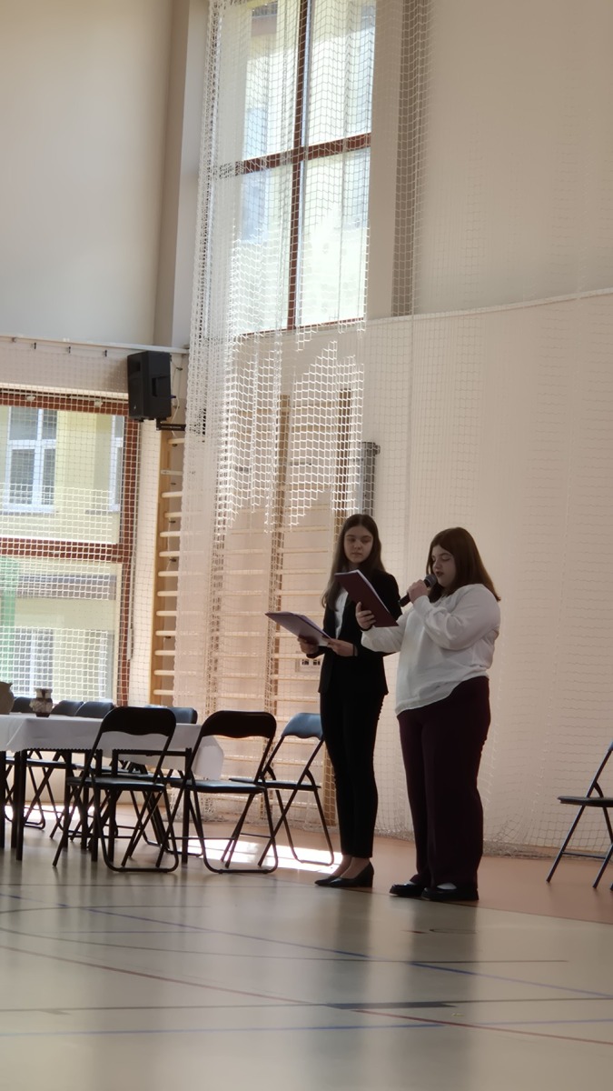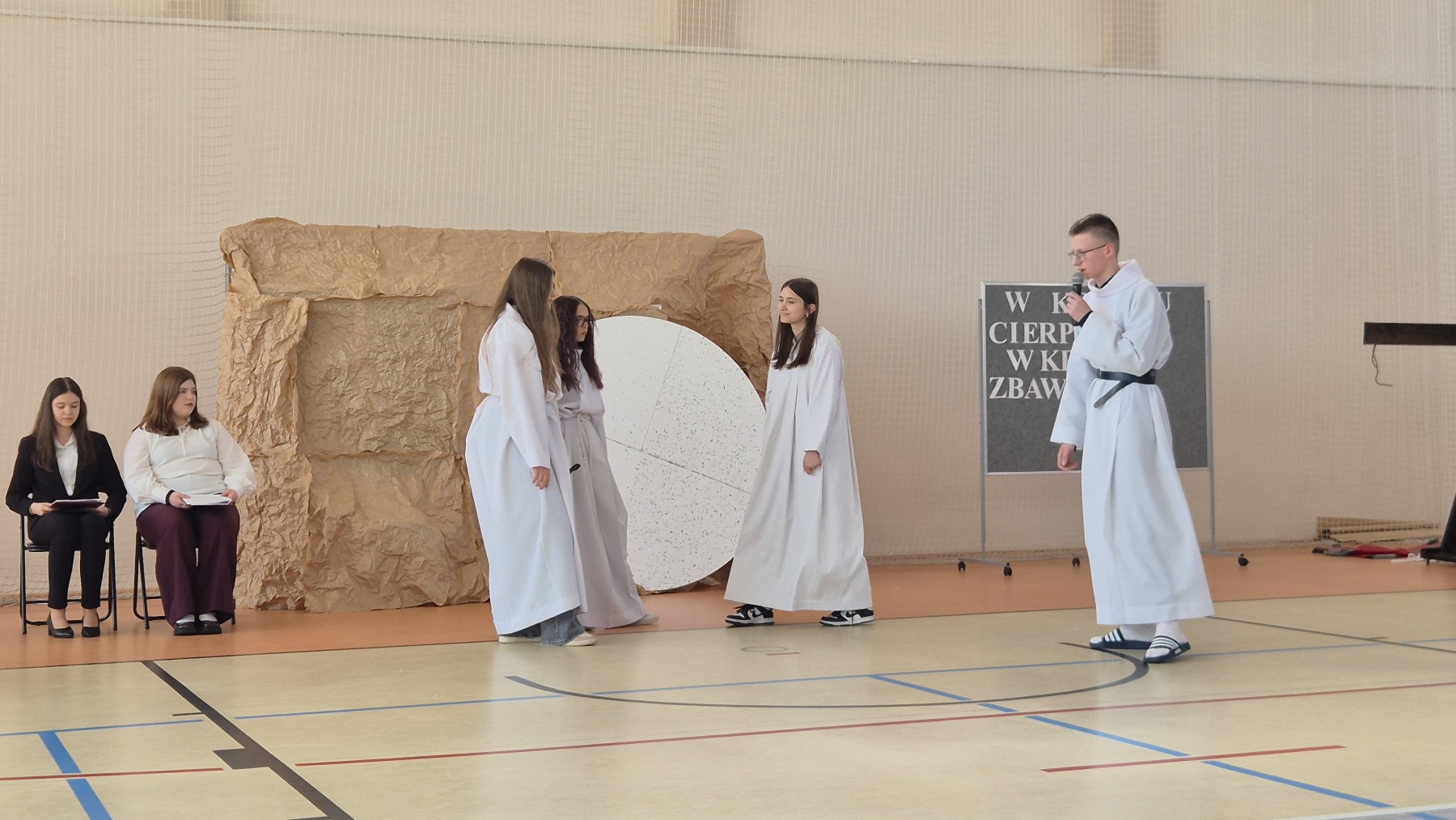 Na początku uroczystego spotkania głos zabrał ksiądz Marek, wprowadzając zebranych w nastrój refleksji i zadumy oraz tematykę przedstawienia. Na zakończenie p. Dyrektor wyraził wdzięczność za zaangażowanie, trud i serce włożone w przygotowanie spektaklu, a następnie wspólnie z księdzem Markiem skierowali do całej społeczności szkolnej serdeczne życzenia wielkanocne.