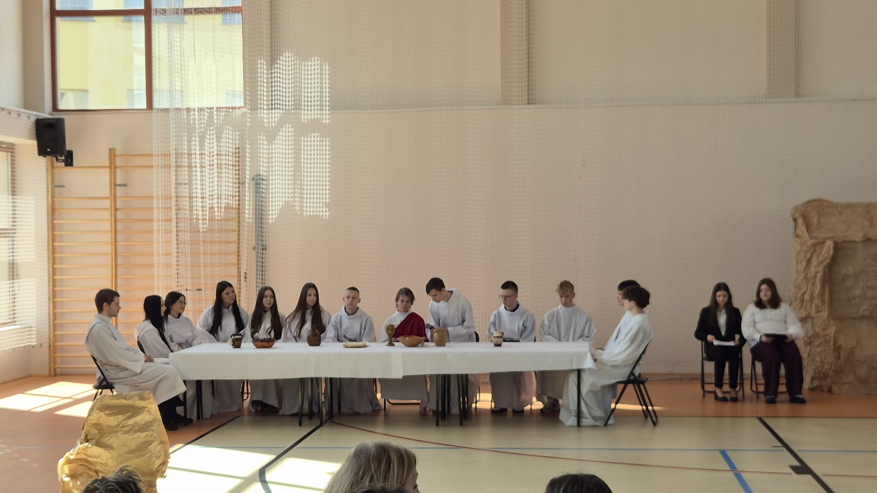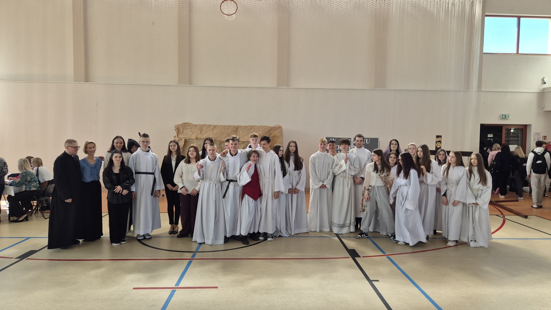 1 kwietnia 2026 r. w I Liceum Ogólnokształcącym im. Adama Mickiewicza w Kolnie odbyło się wyjątkowe przedstawienie pt. „Pasja Jezusa z miłości do człowieka”, przygotowane z okazji zbliżających się Świąt Wielkanocnych. Inscenizacja została opracowana przez księdza Marka Ulatowskiego i zaprezentowana przez młodzież naszej szkoły pod Jego kierunkiem.