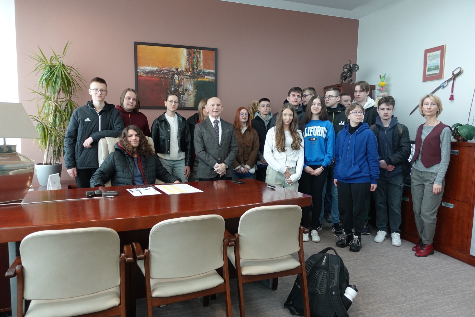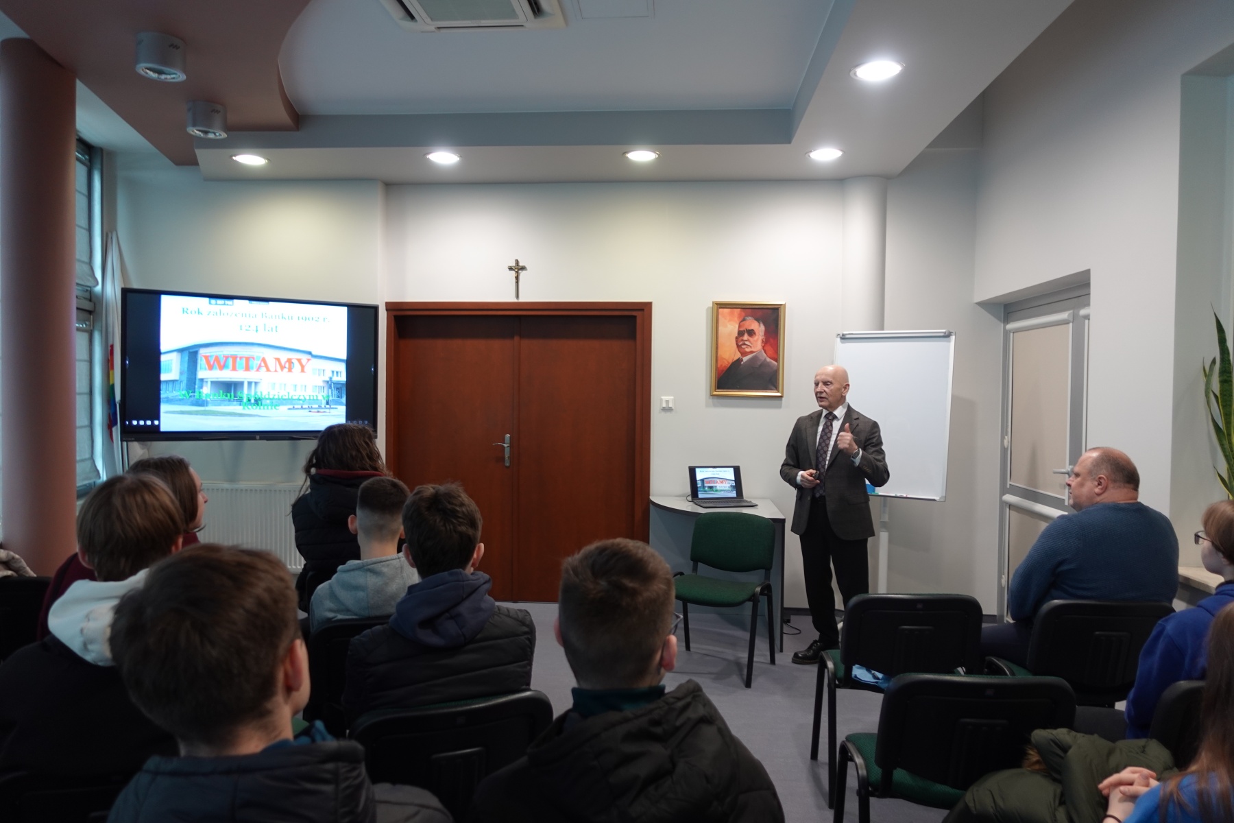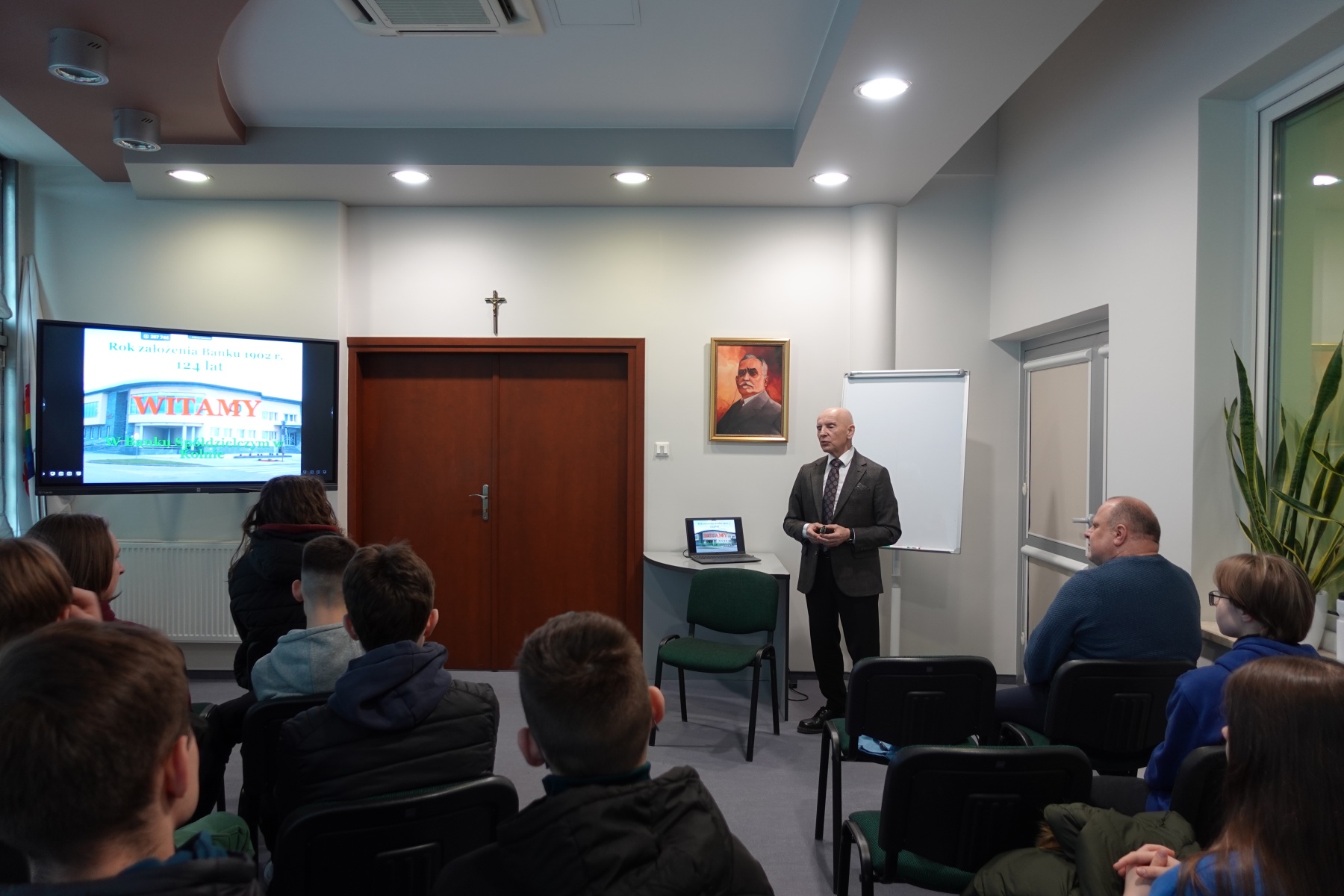 Pan Prezes przyjął nas niezwykle ciepło i serdecznie, tworząc atmosferę sprzyjającą rozmowie i refleksji. Podzielił się swoją historią edukacyjną i zawodową, pokazując, jak ważne są wytrwałość, pasja oraz otwartość na ludzi w budowaniu własnej drogi życiowej. W swojej opowieści Pan Krzysztof Kajko podkreślał szacunek do drugiego człowieka natomiast rady skierowane do młodzieży pełne były życiowej mądrości oraz autentycznego zaangażowania. Uczniowie mogli przekonać się, że sukces zawodowy można łączyć z rozwijaniem pasji – Pan Krzysztof Kajko spełnia się bowiem nie tylko jako Prezes Banku, ale także muzycznie, a swoją działalnością filantropijną wspiera innych.