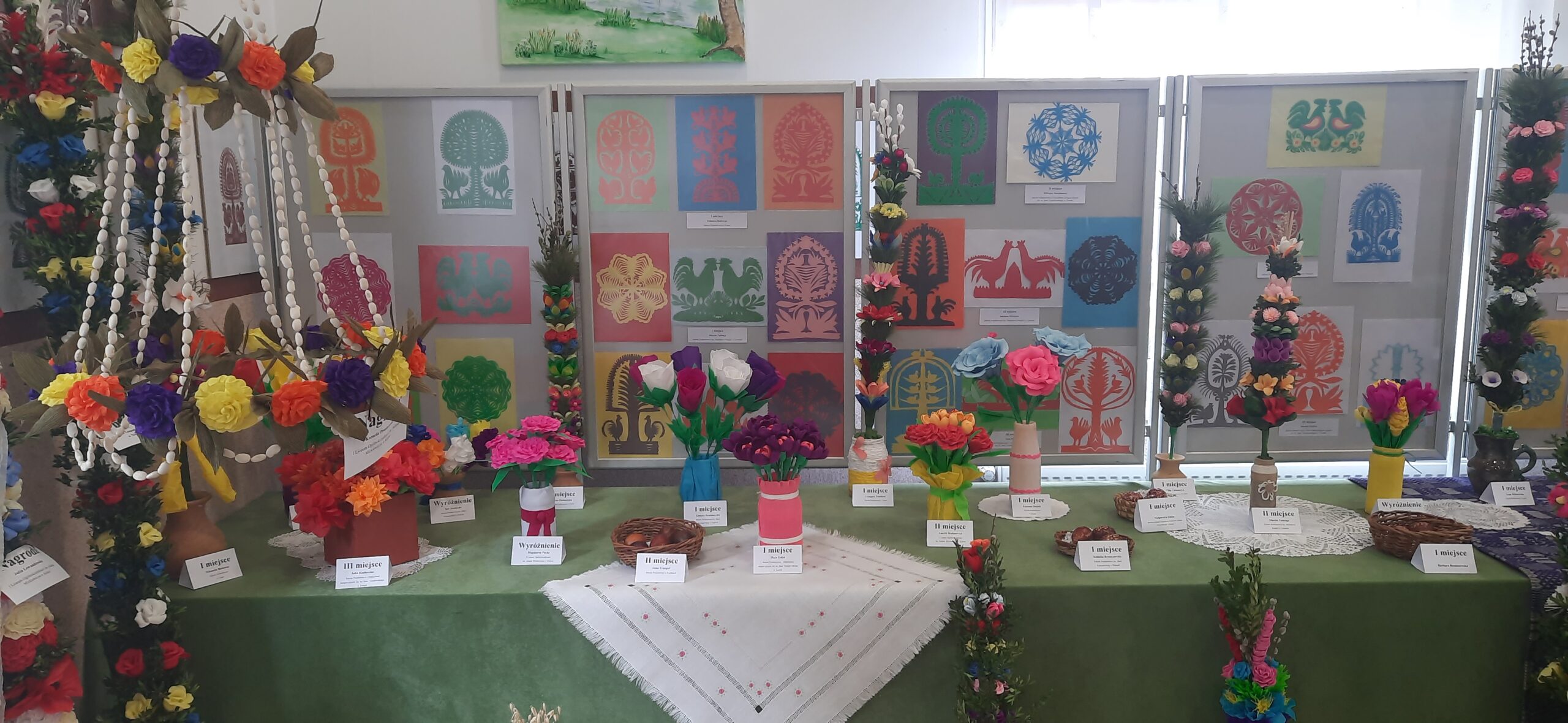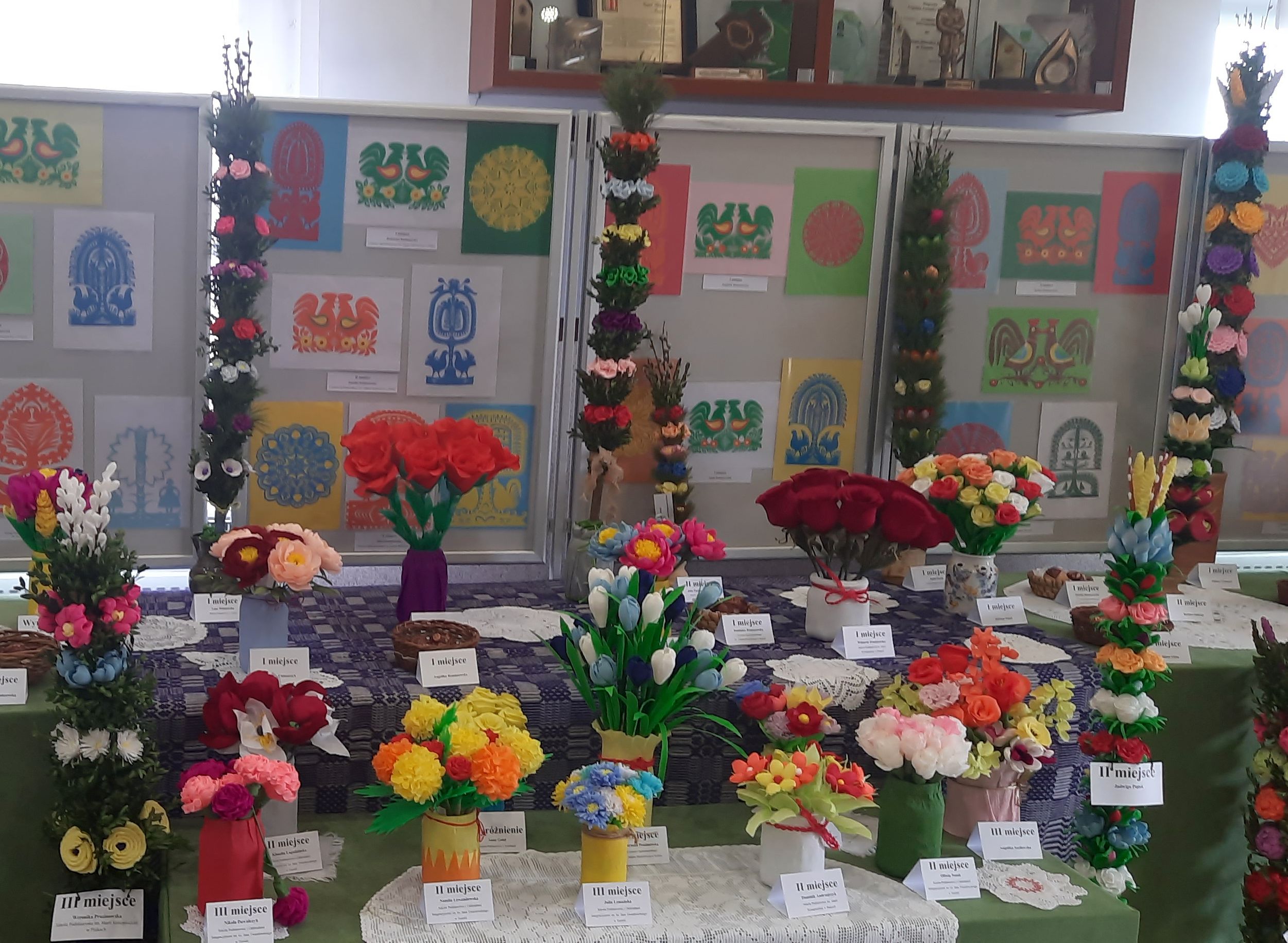 Konkurs plastyki obrzędowej obejmował swoim zakresem wykonanie prac plastycznych z zakresu: bukiet kwiatowy, bukiet na patyku, palma wielkanocna, kierc, wycinanki oraz pisanki.