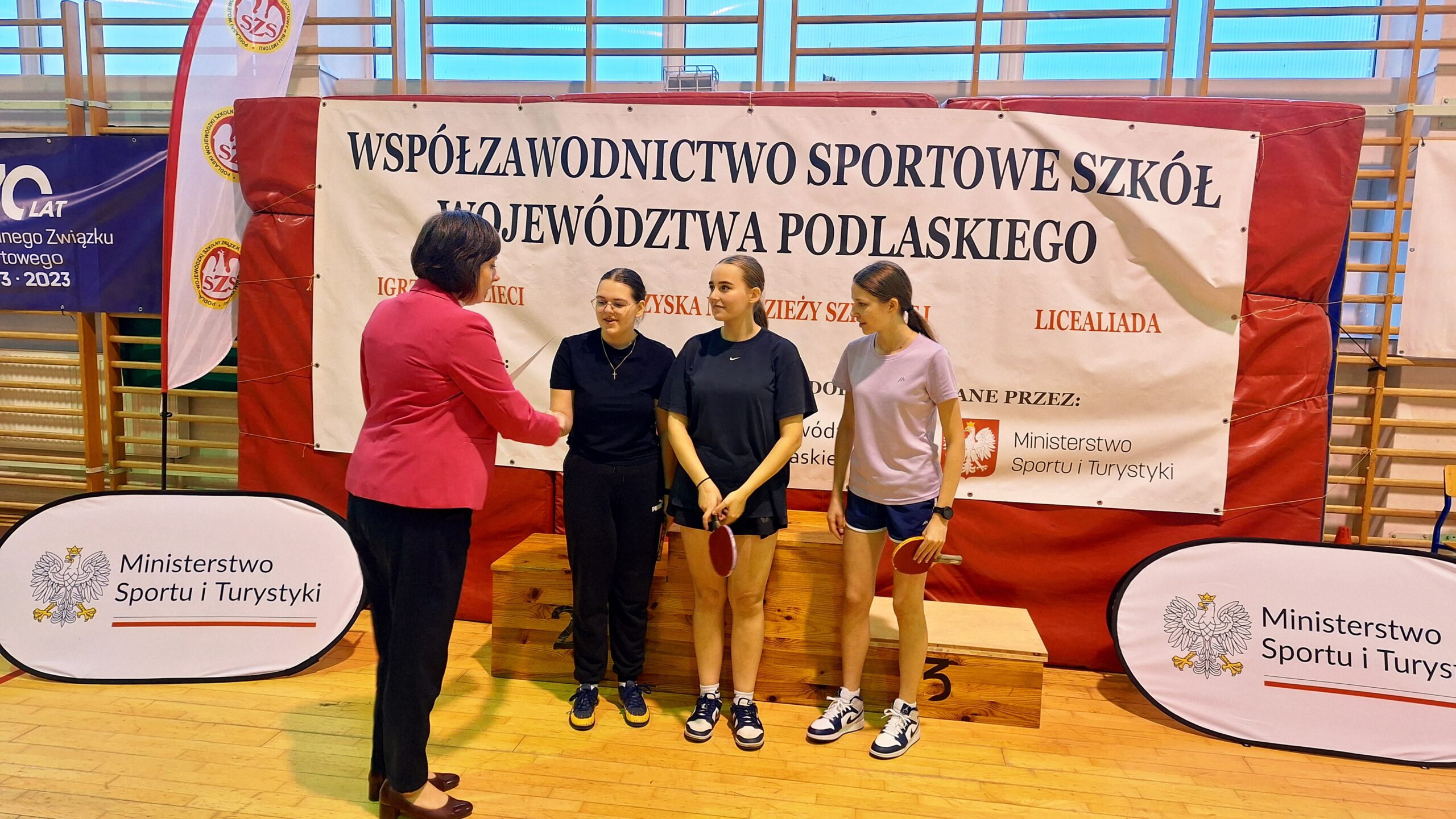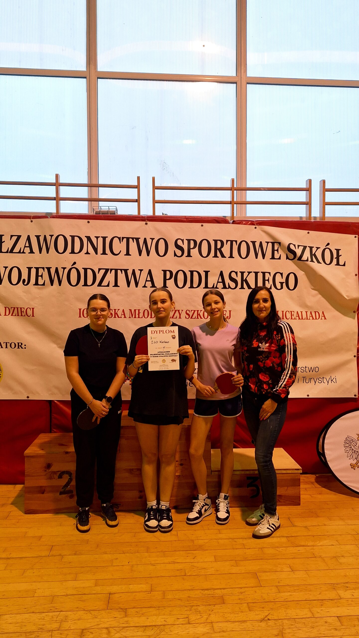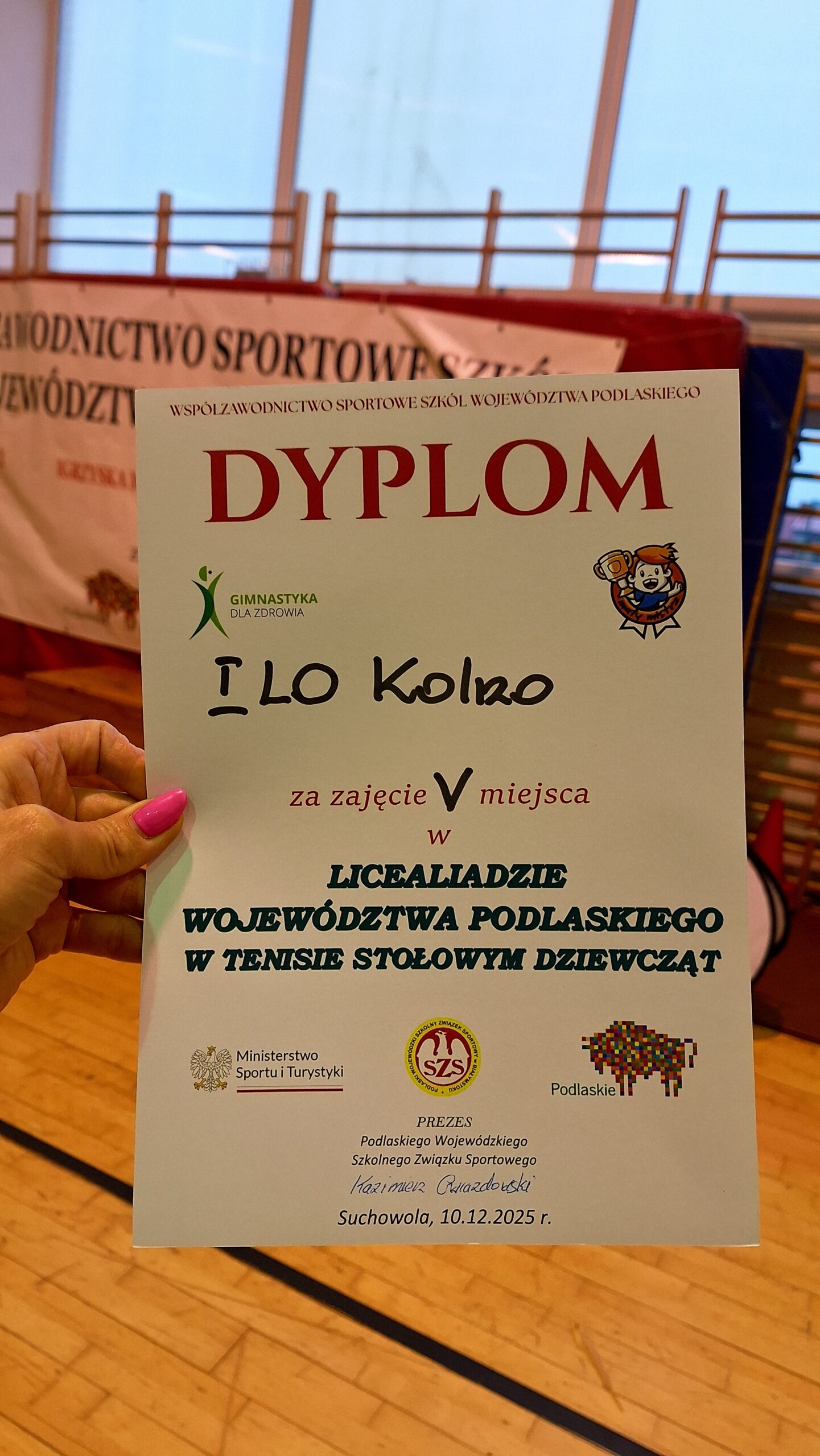 Dnia 10.12.2025r. w Zespole Szkół w Suchowoli rozegrano Finał Licealiady w tenisie stołowym dziewcząt. W zawodach wystartowało 13 drużyn. Nasze dziewczęta w składzie: Gabriela Mroczkowska, Julia Ałajko i Martyna Krawczyk, zaliczyły udany start. Drużyna I LO Kolno pokonała 4:3 ZST Suwałki, 4:2 ZS Bielsk Podlaski i 4:0 VI LO Białystok. Przegrałyśmy po zaciętej walce 4:3 z III LO Suwałki, zajmując ostatecznie V miejsce. Brawo dziewczyny!