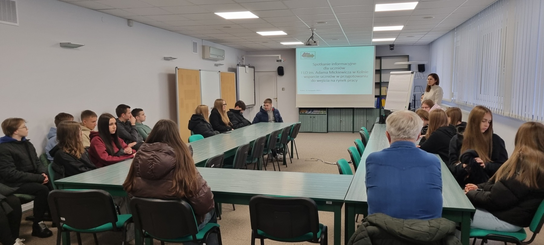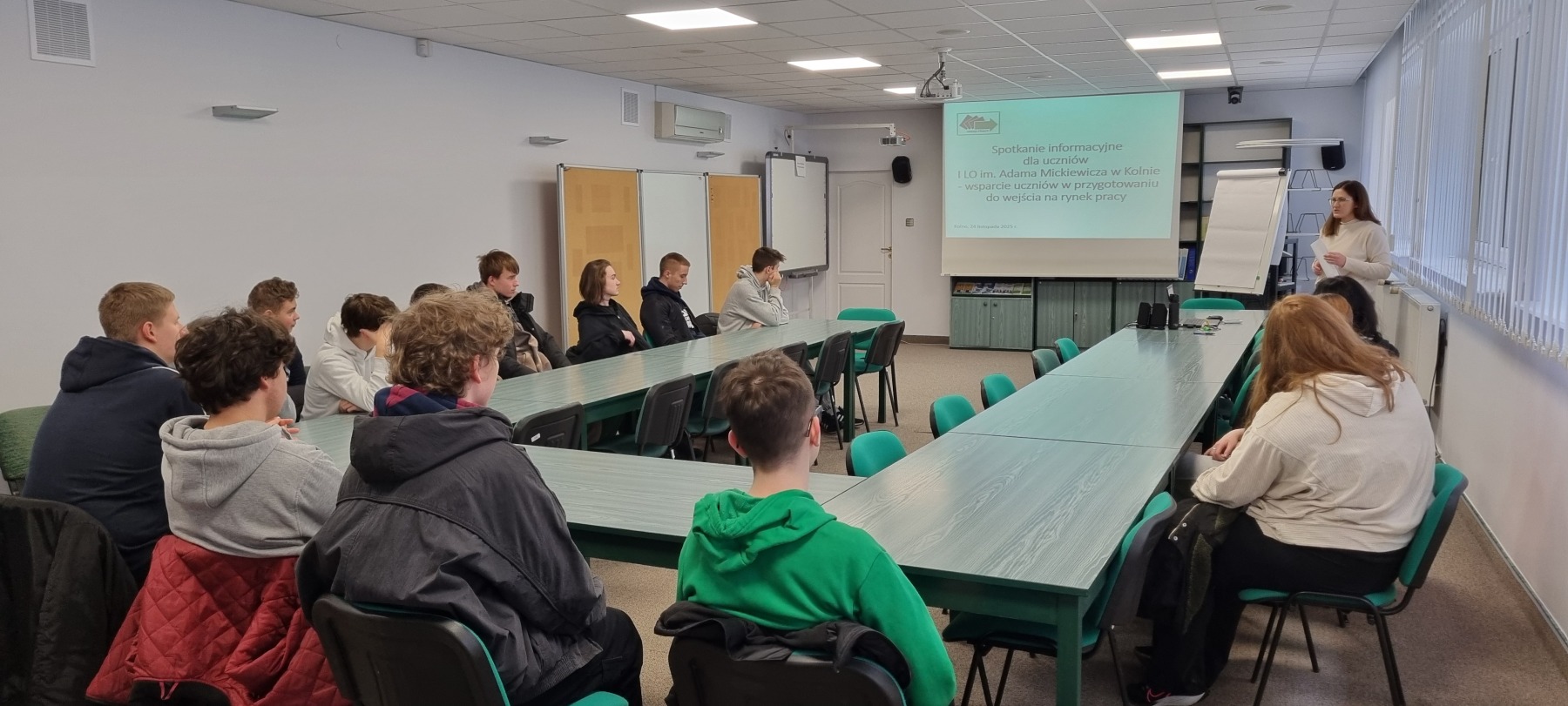 W dniach 20, 24 i 25 listopada 2025 r. uczniowie klas 1c, 2a oraz 3b, c i e (łącznie 59 osób) uczestniczyli w wizytach studyjnych w Powiatowym Urzędzie Pracy w Kolnie, zorganizowanych w ramach realizacji Projektu „Kariera bez Barier”.