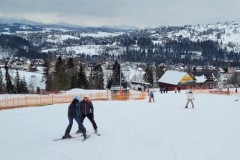 Na dzień przed naszym przyjazdem spadł świeży śnieg. Nie było go tyle, co w czasie minionych ferii, ale wystarczająco, by pokazać jakie potrafi płatać figle kierowcom. Nasz smok-autokar utknął tuż pod domem i trzeba było sypnąć mu pod koła czymś chropowatym, żeby poradził sobie ze śliską nawierzchnią. A i w Bukowinie Tatrzańskiej miał nie lada kłopot z nawrotem na wąskiej zaśnieżonej uliczce. Stanął w poprzek drogi wbijając się tyłem w okna domów, a przednimi kołami zahaczając o zjazd z przydrożnego stoku narciarskiego.